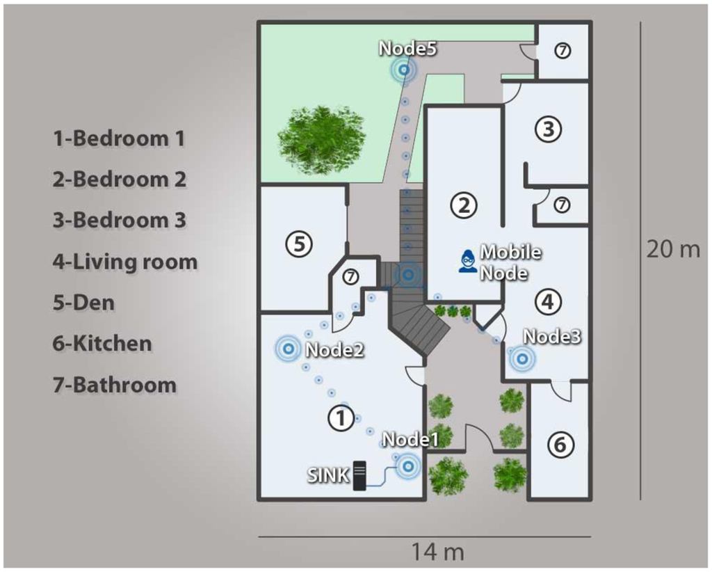As a proof of concept for the proposed architecture, five WiSe nodes and one Mobile Node were deployed in a 14 m × 20 m home, in order to mount a WSN infrastructure and ensure coverage throughout the entire home. A 128-bit AES encrypting mechanism was also used to secure all data transmitted throughout the network.