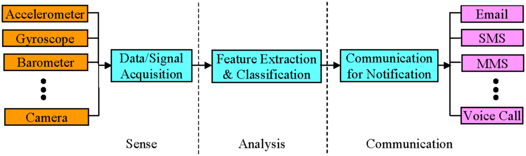 Fall detection and fall prevention systems have the same basic architecture as shown in Figure 1. Both systems follow three common phases of operation: sense, analysis and communication. The basic difference between the two systems lies in their analysis phase with differences in their feature extraction and classification algorithms. Fall detection systems try to detect the occurrence of fall events accurately by extracting the features from the acquired output signal(s)/data of the sensor(s) and then identifying fall events from other activities of daily living (ADL). On the other hand, fall prevention systems attempt to predict fall events early by analysing the outputs of the sensors. Data/signal acquisition, feature extraction and classification, and communication for notification are the necessary steps needed for both fall detection and prevention systems. The number and type of sensors and notification techniques however, vary from system to system (some examples are shown in Figure 1). In conventional systems, discrete hardware components are used for the implementation of each unit, whereas in SP-based systems, all required units may already be in-built within a state-of-the-art SP.