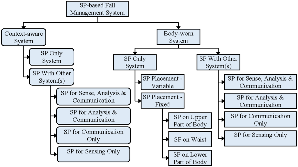 This paper is organized in five sections: Section 2 discusses the basic architecture and taxonomy of SP-based fall detection and prevention systems. A comparative analysis of the reviewed articles is provided in Section 3, illustrated by tables and graphs. Section 4 highlights the challenges of the SP- based solutions and also discusses some open issues. Finally, the concluding part—Section 5—points out important observations and areas that need further research.