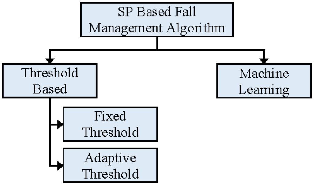 After measuring the physical quantities by using sensors, obtained signals/data should be analysed. In this phase, the significant features are extracted from the sensor's outputs and preliminary decisions are made by classifying and analysing those extracted features. Most SP-based solutions, especially solutions for fall detection, use a Threshold-Based Algorithm (TBA). The most vital reason for choosing TBAs is that these algorithms are less complex and hence require the lowest computational power [9], which helps to reduce battery power consumption [33]. In order to make preliminary decisions about a potential fall event, these algorithms usually compare the sensor's output(s) with predefined threshold value(s). Threshold-based algorithms may use more than one threshold [27] and threshold value(s) could be predefined (fixed) or adaptive. It should be noted that the adaptive threshold values are not calculated dynamically while using the system. Instead, users introduce some physiological data and the system obtains the corresponding threshold that is not re-calculated during the system operation. The algorithm proposed in [34] uses an adaptive threshold which changes with user-provided parameters such as: height, weight and level of activity.