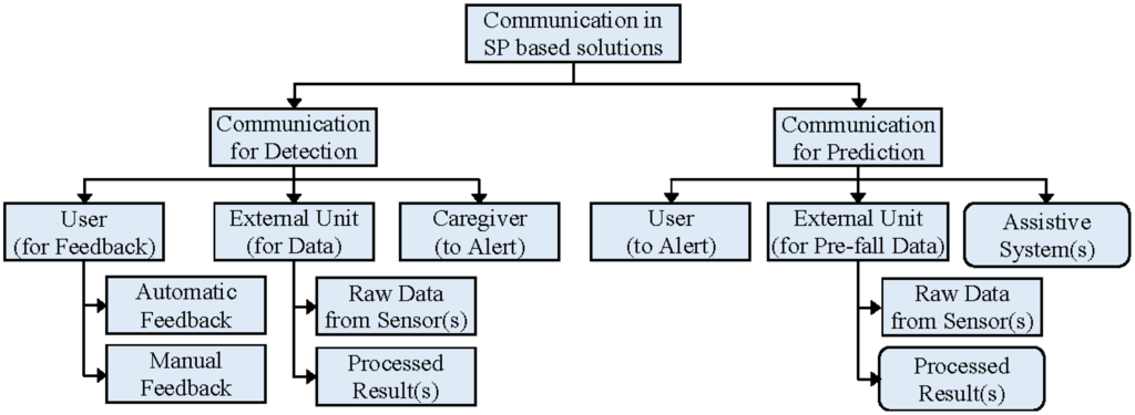 Existing and potential SP-based fall detection and prevention systems communicate with the users, caregivers or assistive systems by sending alert signals, obtaining user or system feedback or activating assistive systems. The taxonomy of communication patterns in SP-based fall detection and prevention is shown in Figure 4. Rectangles and rounded rectangles hold the same meaning as in Figure 2. Detection systems communicate with the users to obtain feedback, whereas prediction systems communicate to alert them about their possible forthcoming falls. Prediction systems are only concerned with pre-fall data, but detection systems deal with pre-fall, post-fall and intermediate data. Finally, detection systems notify caregivers of fall events and ask for help, whereas prediction systems attempt to prevent impending falls with the help of other assistive systems. Some SP-based solutions require external sensing units that may or may not have built-in processors. These external units may transmit either raw data or results after primary analysis. No article has been found, that uses assistive system and/or external processing unit for implementing SP-based fall prevention solution.
