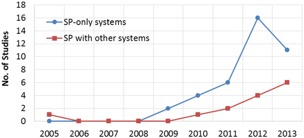 The accelerometer was used in all the reviewed solutions and the GPS receiver is the second most commonly used sensor (42%) followed by the gyroscope. In addition we have performed a time series analysis on SP based fall detection and prevention solutions and the outcome is shown in Figure 5. This line chart shows a comparison of the numbers of studies on SP-only solutions with other solutions having a combination of SP and external devices. In the past few years, though the number of studies on SP-only solutions are higher than those of other SP based solutions, the use of external devices in SP based fall detection and prevention systems is increasing gradually.