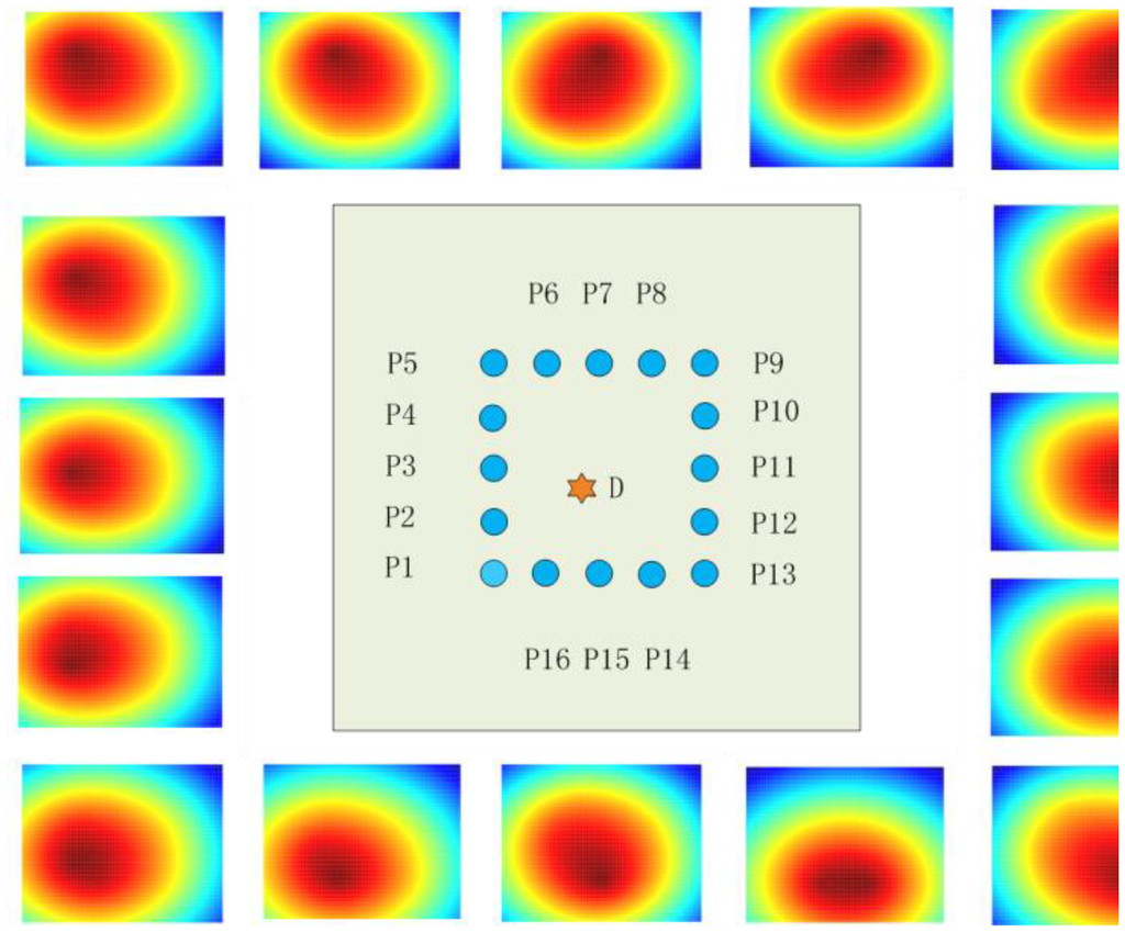 As an example, after probabilistic reconstruction algorithm operations, the tomography maps of the raw signal as excitation at each transducer array spot of an experiment are shown as single maps' figures in Figure 10. The thresholding fusion map of their denoising signals is shown in Figure 11. The tomography of the transducer array sparse optimizing results is illustrated in Figure 12.