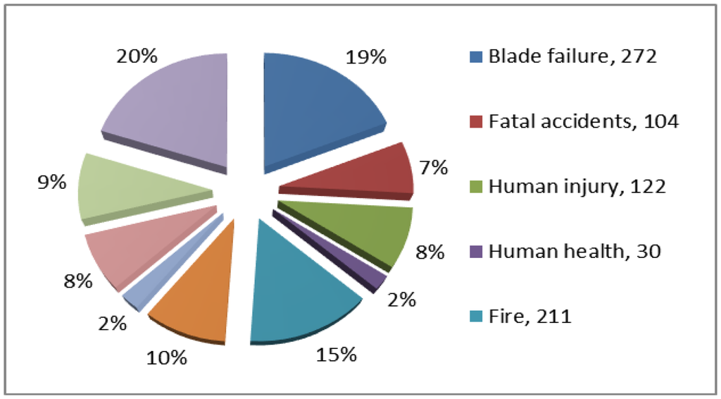 It shows that 19% of all wind turbine related incidents are on account of “blade failure”. While other incidents are mentioned, such as fires (15%), structural failures (10%), environmental damage (9%), human injury (8%), fatal accidents (7%), transport (8%), ice throw incidents (2%), and human health (2%) the statistical analysis distinctly shows that blade failure is the most frequent wind turbine accident [35,36]. This is in line with a recent survey by GCube [37], the largest provider of insurance for renewable energy schemes in the USA.