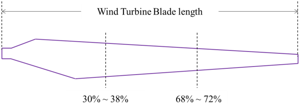 According to the statistical results from the damaged blades in wind-farm, most blade damages are quite regular, and the fractured locations are near the blade root or a place located at 1/3 of the blade length from the tip to the root. The remaining damage situations are relatively less frequent. In the long term monitoring of wind turbines, the causes of the fracture are also typically the same. Figure 4 illustrates the damage-prone locations on the blade, while Ref. [39] shows an example of damage.
