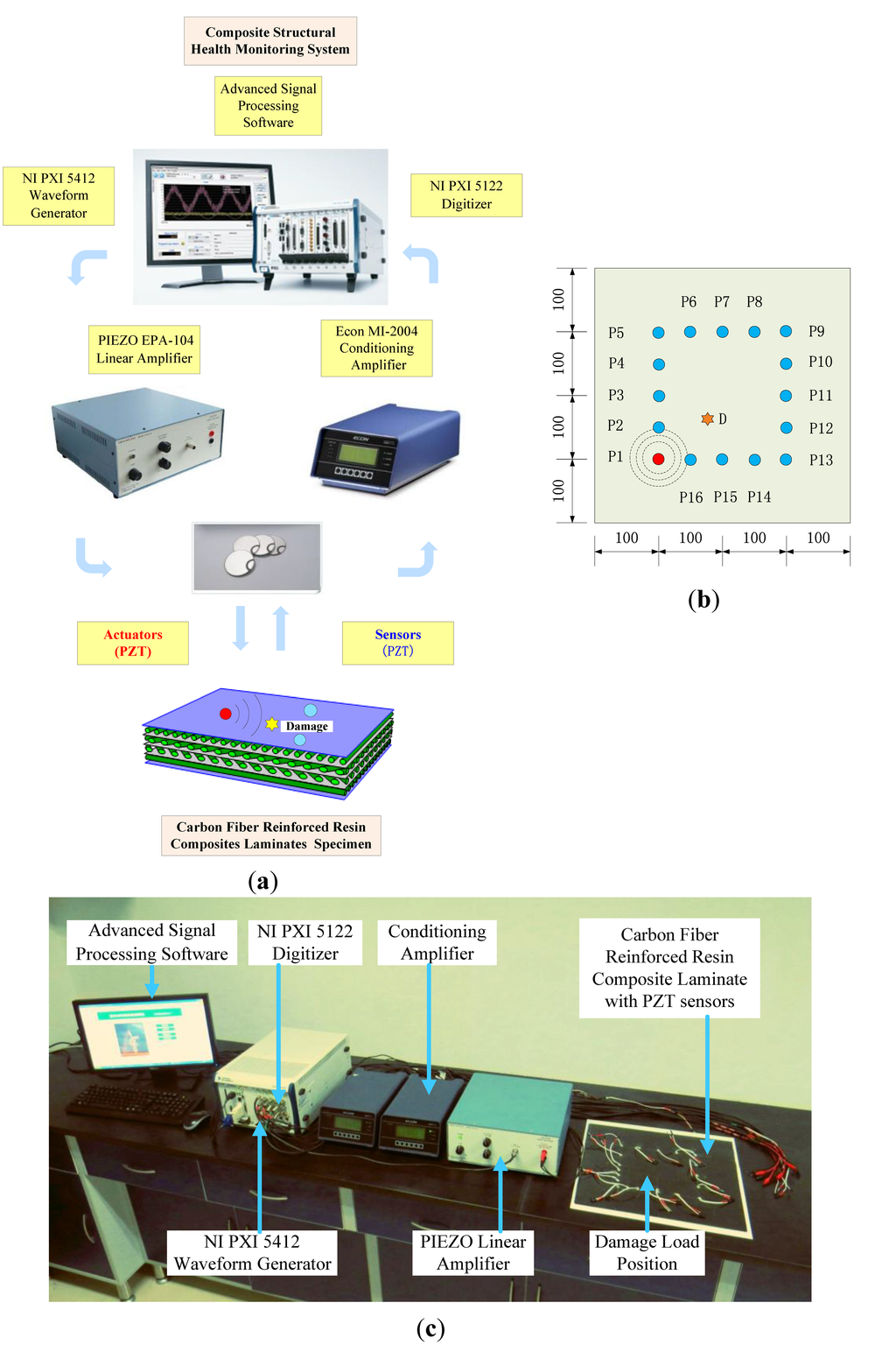 The validation experiment is supported by composite damage monitoring system, as shown schematically in Figure 8a. It is established for emphasizing the advanced signal processing algorithm and mainly constructed on an NI PXI platform which allows further investigation of composite damage mechanisms and detection.