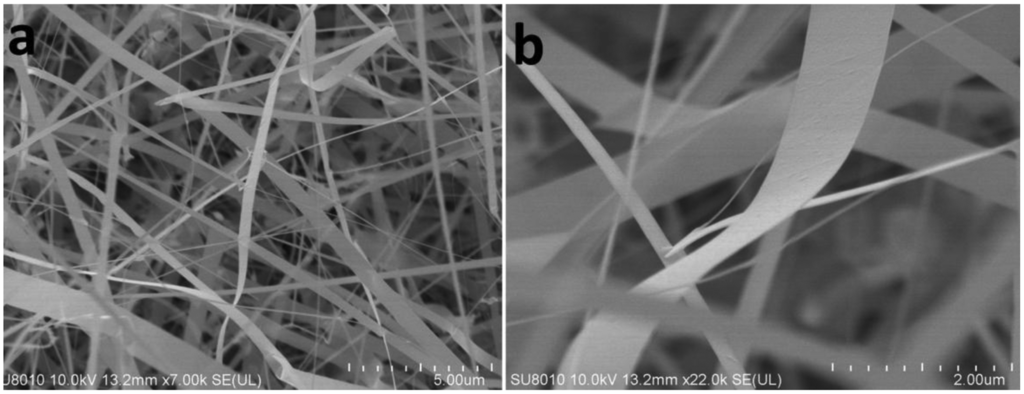 Figure 2 shows SEM images of the CdS nanobelt, it can be seen that the width of the nanobelts was distributed from several hundred nanometers to several micrometers. The thicknesses of most nanobelts were only tens of nanometers.