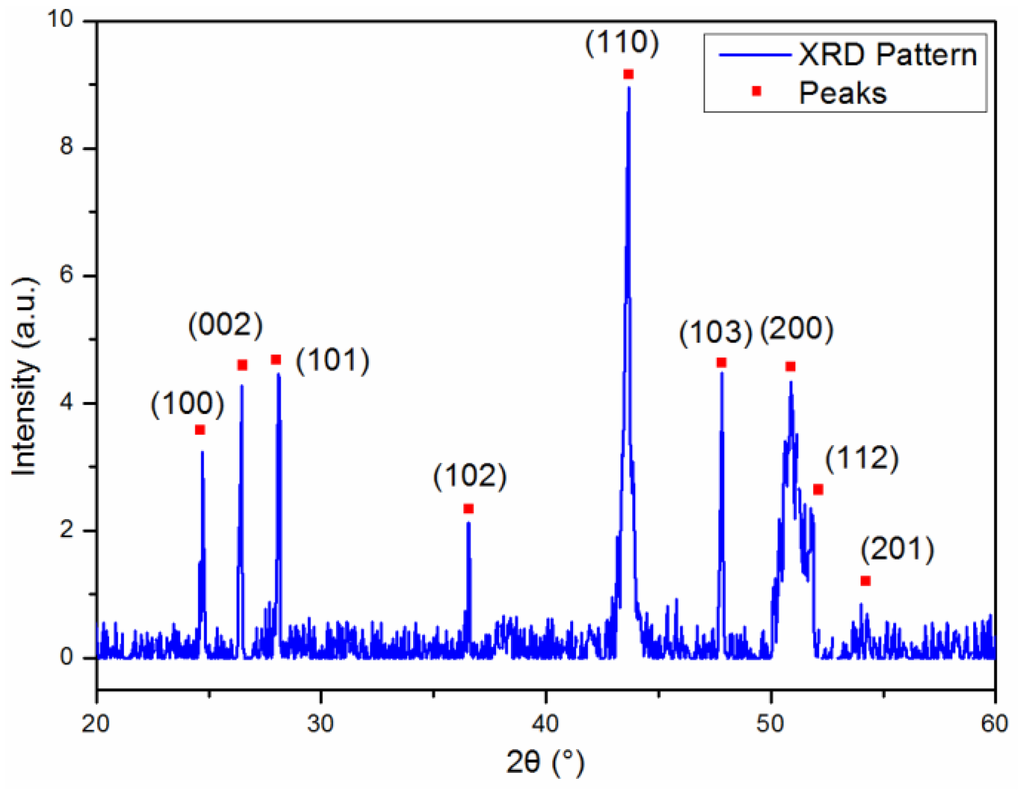 Energy Dispersive X-ray Spectrum (EDS) of the CdS nanobelt indicated that the nanobelt was composed of cadmium (Cd) and sulfur (S), and the elemental ratio of S and Cd was 0.92. Figure 3 shows the XRD pattern of the CdS nanobelts. The diffraction peaks can be indexed to the typical hexagonal wurtzite structure CdS crystal (JCPDS No. 41-1049) with the c = 6.728 Å and a = 4.145 Å consisting with the lattice parameter of wurtzite CdS. No diffraction peaks of cadmium oxide (CdO), Cd, S or other impurities were found.