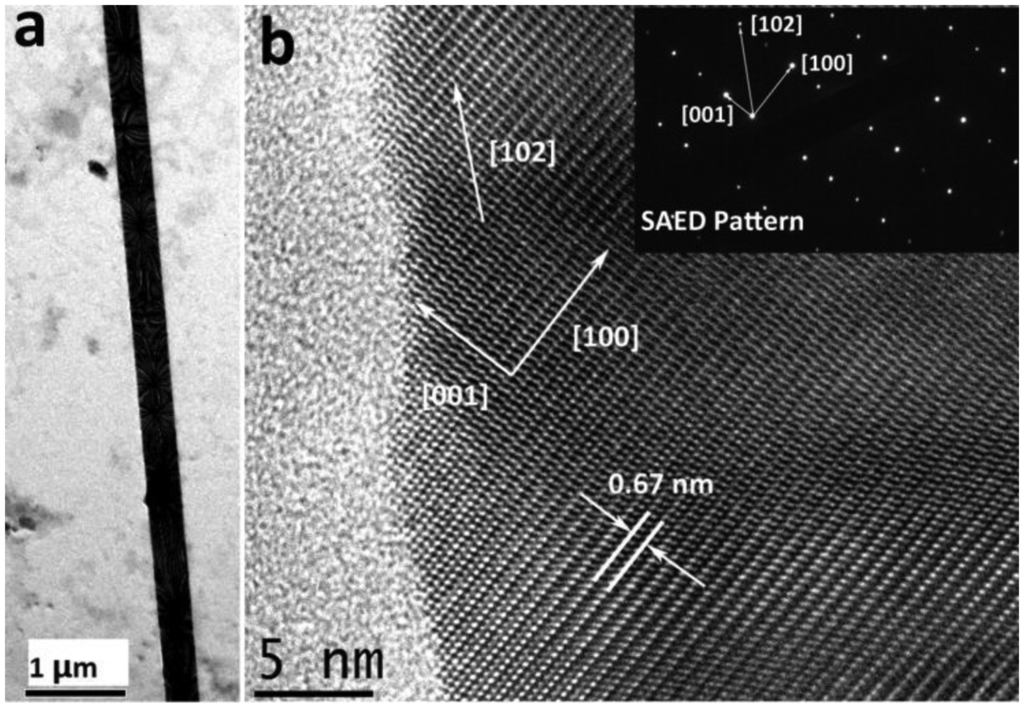 Figure 4 shows the TEM results of the single CdS nanobelt. It can be seen that the as-grown CdS nanobelt presented very uniform width and smooth edges. The interplanar distances was 0.67 nm which corresponds to the hexagonal wurtzite CdS crystal (001) crystal interplanar spacing []. The inset upper right image in Figure 4 was the Selected Area Electron Diffraction (SAED) pattern of the single nanobelt. The nanobelt showed good single crystal quality and the growth orientation was [102].