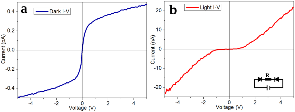 On the other hand, because of the exponential dependence of the photocurrent on the surface charges, the photosensitivity was much higher than the ohmic contact optical sensor which was linearly dependent on the surface charges. Also, because of the configuration of the device, one of the Schottky junctions was reverse biased, which caused an obvious decrease of the dark current and left more space for possible photocurrent improvement [,], so the photosensitivity was much higher than ohmic contact optical sensors.
