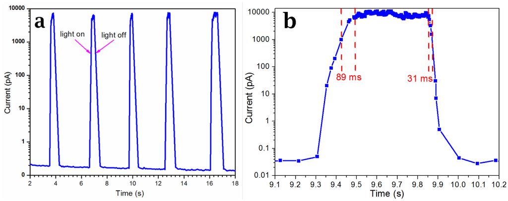 In this paper, CdS nanobelt MSM optical sensors with two Schottky contacts were fabricated. The Schottky contacts were realized by deposition of Pd/Ti (100 nm/20 nm) onto the nanobelt []. The device presented a photosensitivity of about 4 × 104. The decay time was about 31 ms, and the dark current is as low as 0.2 pA.