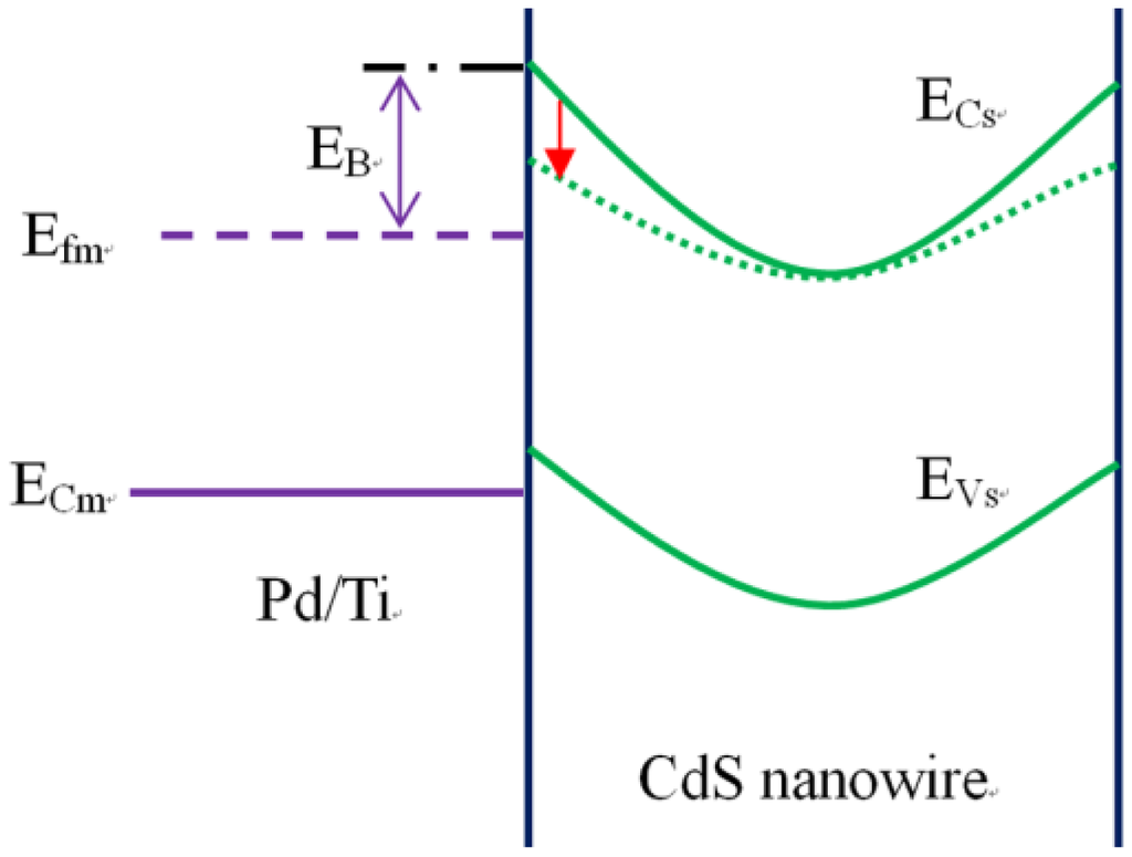 The oxygen in the air can combine with the electrons of the n-type CdS nanobelt and absorb onto the nanobelt surface. This led to an electron depletion layer near the surface of the nanobelt, which can narrow the current channel and reduce the conductivity. For ohmic contact CdS nanobelt optical sensor, the photoresponse was mainly because the adsorbed O2 combined with photon generated holes and desorbed . The depletion layer will be thinned, and the conductance was increased. At the same time, the photon generated carriers were separated by the external electric field and also participated in electric conduction [,,].