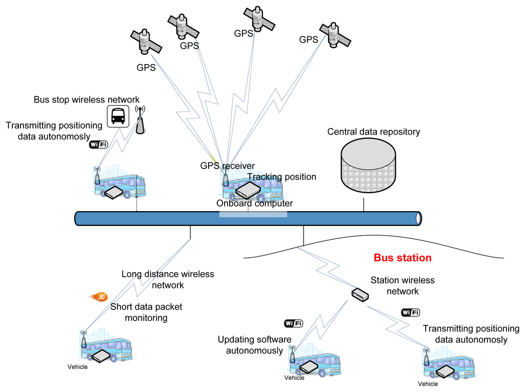 AVL systems are based on the use of different technologies, such as odometers [10], RFID [11] and GPS. These technologies can detect the presence of the vehicle at a specific point, for example, infrared markers, or locate the position of a vehicle at any moment in time, for example, GPS. These systems also have problems: first, they provide no data on the occupation of the vehicle, and second, systems that continually provide the position of the vehicle have a lack of precision. For example, a standard GPS can produce positions with an error radius of 100 m, and different techniques are required to reduce errors to 10 m. Two examples of these techniques are differential GPS, which requires constant communication with a remote place to receive the position corrections, and the technique proposed by Peyraud [12] for urban areas in which satellite signals are low quality that is based on image processing. Another problem associated with these systems is that for the information to be useful, the data must be recorded in a continuous manner.