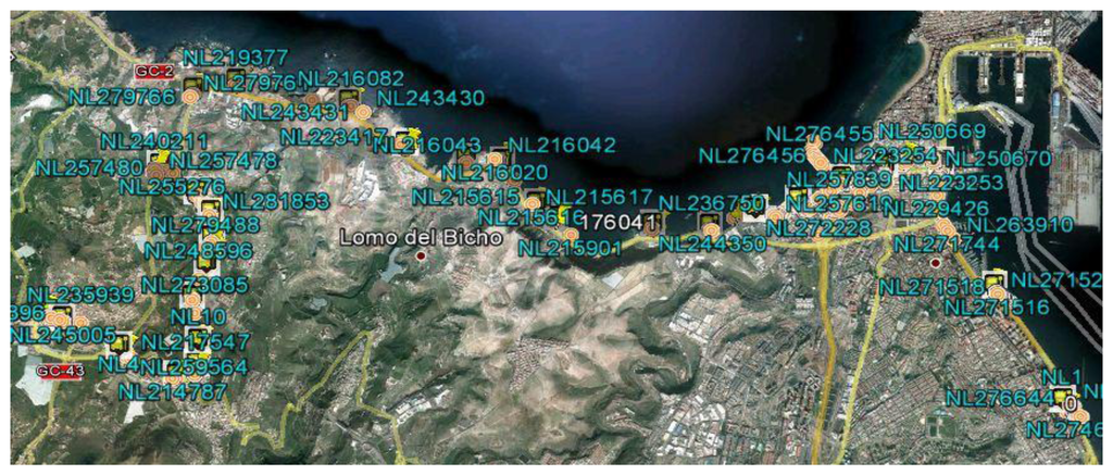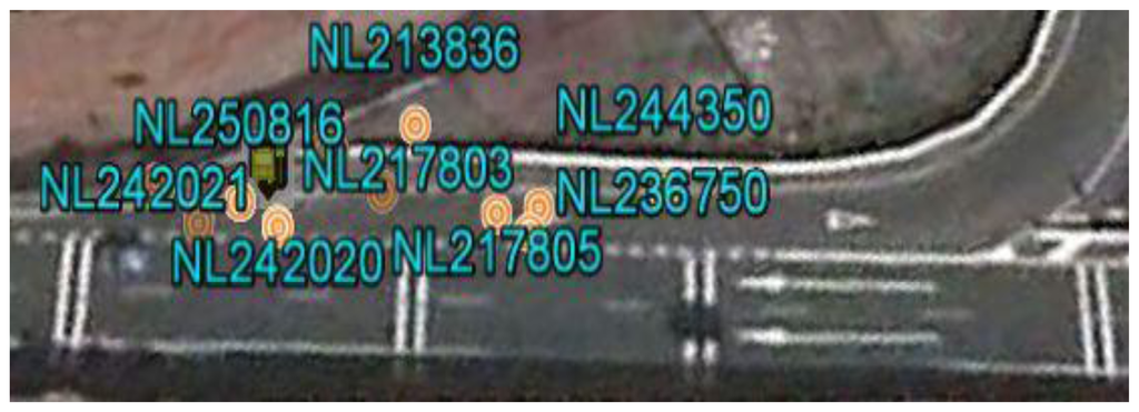 According to what has been discussed, the presence of a cluster without classifying implies a recursive invocation to the identification procedure. The unidentified cluster (type G3) is shown in Figure 5 and is made up of 8896 readings of the initial Z-set. Because of the first invocation, the method identifies a cluster with its centroid identified by tag NL14 located in the urban area and includes two points PP (points with tags 175031 and 175041) and a roundabout (Figure 6). Next, the method is applied recursively, restricted to the readings in this cluster, with the following initial parameters: form three clusters, and the initial approximations to their centroids are the points 175031, 175041 and NL14. When executing the second iteration, three clusters are obtained, represented by centroids NL2 of type G1, NL3 of type G1 and NL14 of type G2, with all the readings at a distance of less than 15 m from the centroid representing its class (Figure 7).