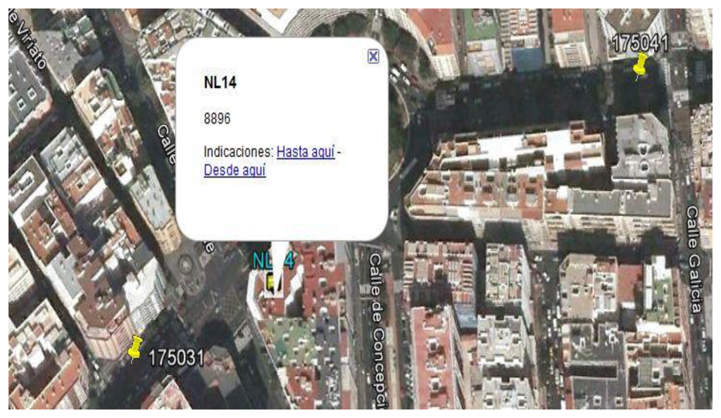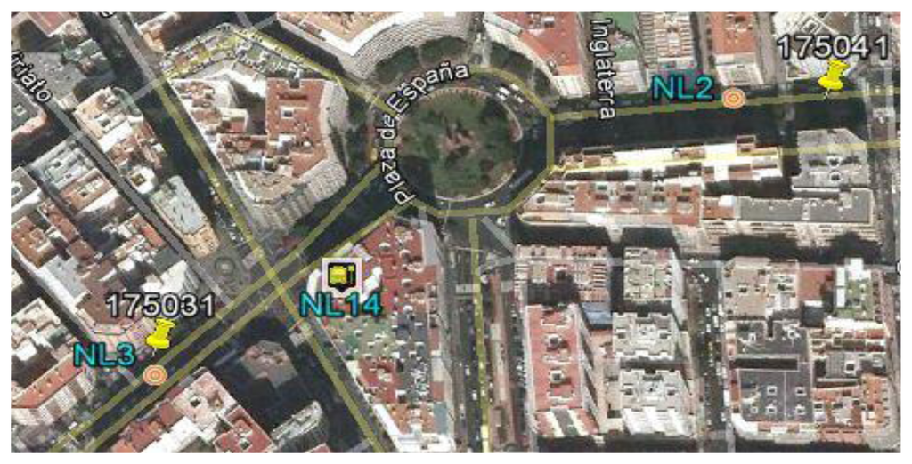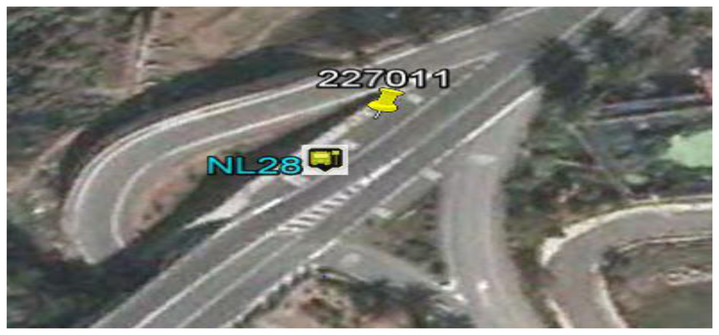 G1: Cluster associated with the PP-set (point of a scheduled stop). If the cluster has a centroid very close to a point in the PP set and the scatter of the readings belonging to the cluster is low, then it is a set of readings associated with a scheduled stop of the vehicle. Because each PP point represents an area reserved for the vehicle to stop, a centroid is considered to be very close to a PP point if the distance between them is not more than 15 m (average length of the area reserved for the vehicle to stop). Figure 3 presents a case of this type on the route being analyzed. An aerial photograph is presented of a stop along the route, where the point with tag NL28 is the centroid of the cluster obtained when applying the K-means algorithm and the point with tag 227011 is the theoretical position of the stop.