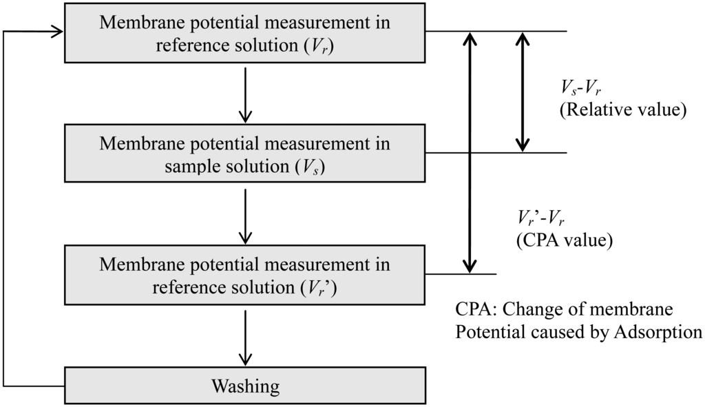 Lipid/polymer membranes were made by means of a conventional protocol [24,25,27]. Usually, the fabricated membranes using this protocol can be used about 3000 times [27]. Measurements were carried out using the TS-5000Z taste-sensing system (Intelligent Sensor Technology, Inc., (Kanagawa, Japan). The measurement procedure was as follows (Figure 3) [24,25,27]. First, the membrane potential for a reference solution (30 mM KCl, 0.3 mM tartaric acid), Vr, was measured by potentiometry between sensor electrodes and a reference electrode (Ag/AgCl electrode). Second, the membrane potential for a sample solution, Vs, was determined. The difference between Vs and Vr, that is, Vs-Vr, is defined as a relative value. Then, the membrane potential for the reference solution was measured again (Vr'), and the difference between Vr' and Vr, that is, Vr'-Vr, was called the CPA value (change in membrane potential caused by adsorption) [24,25,27]. Finally, the membrane was rinsed with a sensor-rinsing solution (30 vol% ethanol, 100 mM KCl and 10 mM KOH). This procedure was repeated five times for each sample, and the average of the relative or CPA values was used as the relative or CPA value of each sample, respectively.