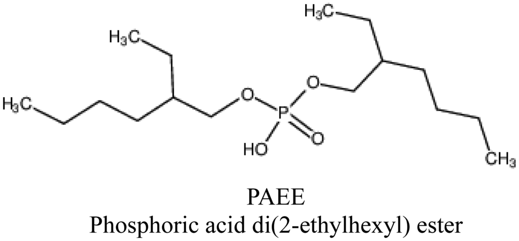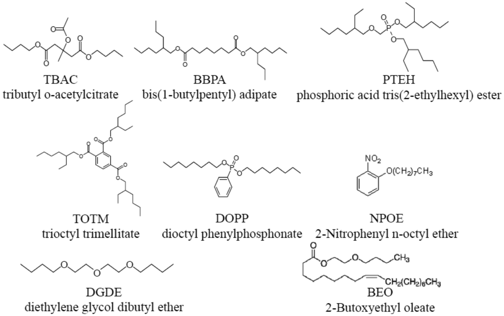 Lipid/polymer membranes comprising phosphoric acid di(2-ethylhexyl) ester (PAEE, Tokyo Chemical Industry Co., Ltd., Tokyo, Japan, Figure 4) as a lipid, PVC and a plasticizer were fabricated. PAEE is one of the lipids used in the commercially available taste sensors. This lipid has negative charges in an aquous solution. The plasticizers used (Figure 5) were as follows: tributyl O-acetyl citrate (TBAC, Tokyo Chemical Industry Co., Ltd., Tokyo, Japan), bis(1-butylpentyl) adipate (BBPA, Sigma-Aldrich Co. LLC., St. Louis, MO, USA), phosphoric acid tris(2-ethylhexyl) ester (PTEH, Tokyo Chemical Industry Co., Ltd., Tokyo, Japan), trioctyl trimelitate (TOTM, Tokyo Chemical Industry Co., Ltd., Tokyo, Japan), dioctyl phenyl phosphonate (DOPP, Dojindo Molecular Technologies, Inc., Kumamoto, Japan), 2-nitrophenyl n-octyl ether (NPOE, Dojindo Molecular Technologies, Inc.), diethylene glycol dibutyl ether (DGDE, Sigma-Aldrich Co. LLC., St. Louis, MO, USA) and 2-butoxyethyl oleate (BEO, Dojindo Molecular Technologies, Inc., Kumamoto, Japan). The quantities of the lipid and a type of plasticizer contained were the same in each membrane. These eight types of lipid/polymer membrane (an amount of PAEE × 8 types of plasticizer) were used as the sensor membranes of eight sensor electrodes to measure basic taste samples (Table 1). Since the CPA values generally had higher selectivity than the relative values because of the unresponsiveness to electrolyte tastants (saltiness, sourness and umami substances) [24–27,36,37], we focused our attention on the CPA values rather than the relative values in this study. In addition, three required specifications are aimed at in terms of the commercial availability of the sensor as a sweetness sensor for positively charged sweeteners. One of the requirements was a response of at least 20 mV to 10 mM aspartame in terms of the CPA value. Another requirement was not to respond to any other basic tastes (high selectivity). The other was the concentration dependence of the responses to aspartame.