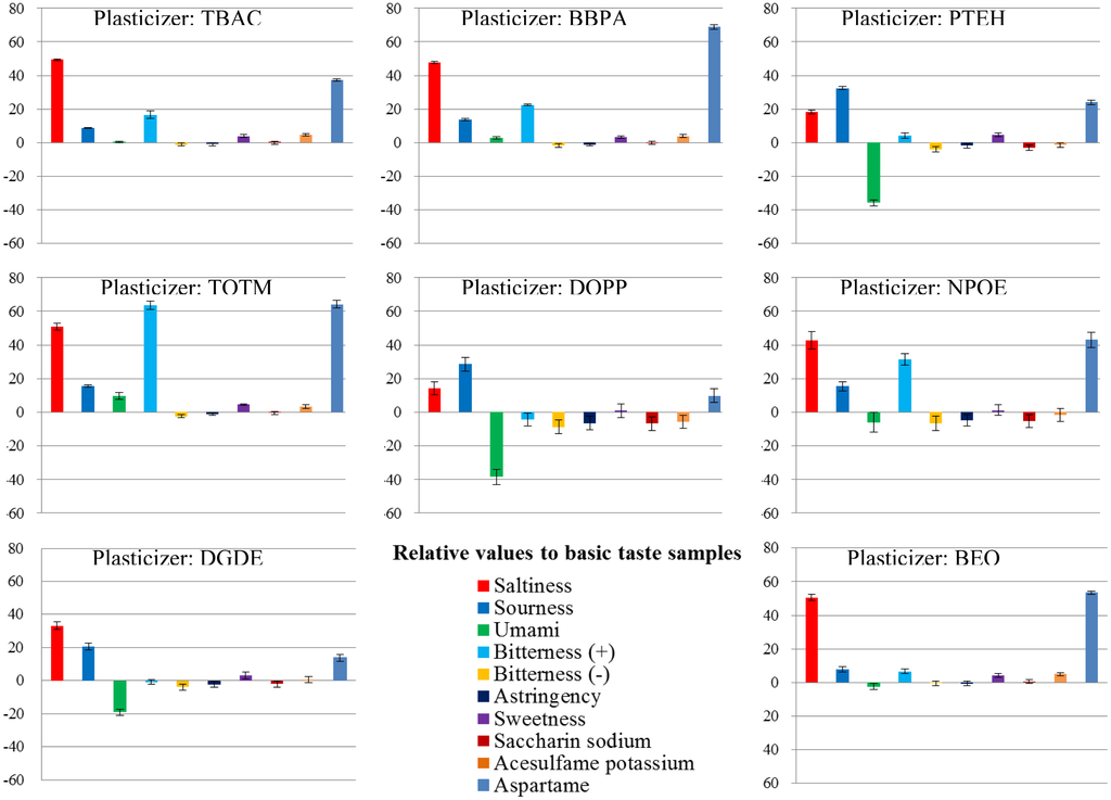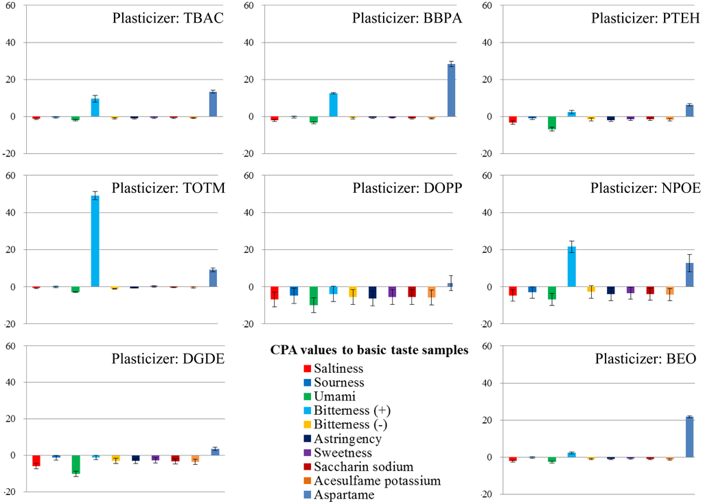 To investigate the patterns and ratios of membrane components suitable for the sweetness sensor, we used PAEE as a lipid, PVC as a polymer and eight types of plasticizer. First, we examined which plasticizer was the most suitable. Using each plasticizer with PAEE in each membrane, we fabricated eight lipid/polymer membranes and measured the basic taste samples using them. The results of the measurements are shown in Figures 6 and 7. Most of the basic tastes mostly showed negligible CPA values. Three of them (saltiness, sourness and umami) often showed large relative values. This appears to be caused by the low hydrophobicity of these tastants. In general, high CPA values are caused by tastants with high hydrophobicity. Bitterness (–), astringency, saccharin sodium and acesulfame potassium (Table 1) mostly showed negligible relative and CPA values. These tastants had negative electric charges in sample solutions and evoked repulsive electrostatic interactions with negatively charged sensor membranes. Sucrose (sweetness sample) also exhibited negligible relative and CPA values because of the uncharged substance. Without the adsorption of tastants, these five samples exhibited negligible responses. Hence, only two samples, bitterness (+) and aspartame, often exhibited high CPA values.