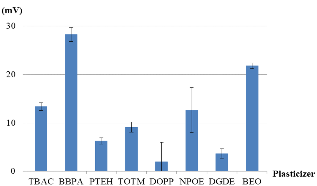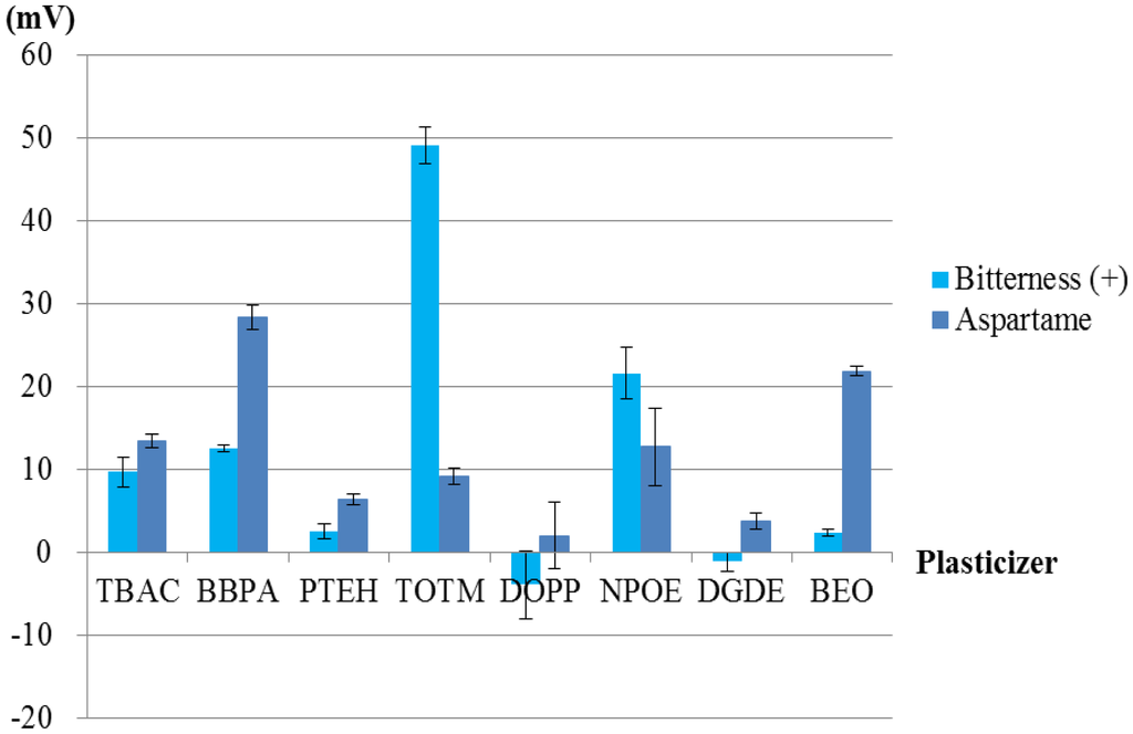 Figures 8, 9, 10 and 11 show only bitterness (+) and aspartame because of the negligible CPA values of the others. The responsivity to the aspartame sample in terms of the CPA values was as follows (Figure 8). Two membranes including BBPA or BEO as a plasticizer met the requirement of a response of at least 20 mV to 10 mM aspartame. The selectivity of each membrane is shown in Figure 9. The membrane using the plasticizer BBPA did not meet the selectivity requirement because of the high CPA value to bitterness (+). On the other hand, the membrane including the plasticizer BEO indicated high selectivity. Since there was no interfering taste, the plasticizer BEO was chosen as the plasticizer in the sensor for positively charged sweeteners in this study.