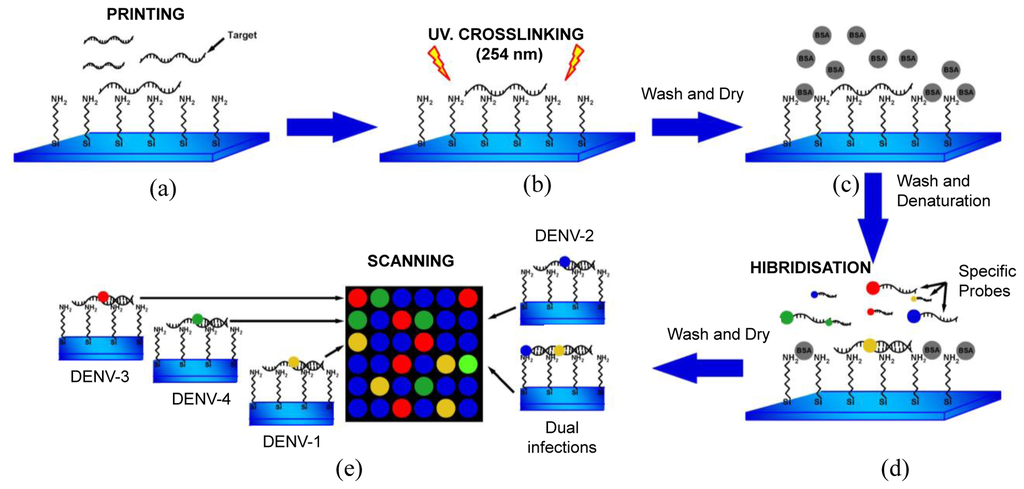 DNA microarray targets (RT-PCR product of DV1 and DV3) [19] were immobilized as follows (Figure 1). Targets (50–100 ng·μL−1) were denatured (10 min at 92 °C) and diluted in buffer [1.6 mol·mL−1 CHAPS, 1% CAPS, 50% DMSO buffer (pH 6.5)], and then printed on NEXTERION® Slide A+ aminosilane-coated slides with a Robot Spotter GeneTAC G3 (Genomic Solutions, Harvard Bioscience, Boston, MA, USA) at 55% relative humidity and a temperature of 20 °C to 25 °C (Figure 1a). Each solid pin delivered a volume of approximately 1 nL, which was designed to create a spot diameter of 300 μm. The centre-to-centre spacing of bright spots was 500 μm. The DNA was UV (254 nm)-cross linked at 250 mJ cm−2 and the slides were incubated for 20 min at 75 °C as shown in Figure 1b, followed by extensive washing with 0.1% SDS and two rinses with double-deionized water. The chips were blocked with pre-hybridisation buffer (4× SSC, 1% SDS, and 10 mg·mL−1 BSA) for 45 min at 42 °C, washed with double-deionized water for 20 s, and dried by filtered air flow (Figure 1c).