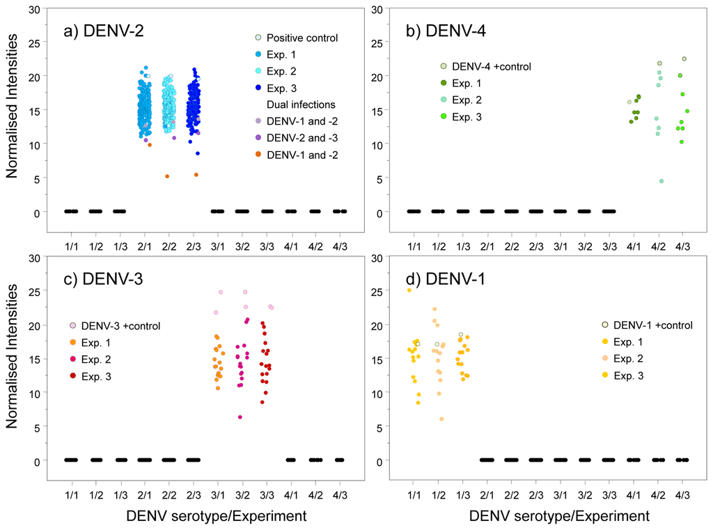 The primary advantages of this microarray technique include the speed at which high numbers of specimens can be screened for the presence of DENV with high sensitivity and specificity for single and dual serotype infections. The speed of specimen detection can be improved by using a microfluidic microarray system [42,43]. Fluorescence variability was very low in our assays, suggesting this technology will be very useful for DENV diagnoses. Detection of two cases of dual infections (DENV-2 and -1; and DENV-2 and -3) confirm the feasibility of using this microarray assay to diagnose dual infections (Figure 4) [20,21,44].