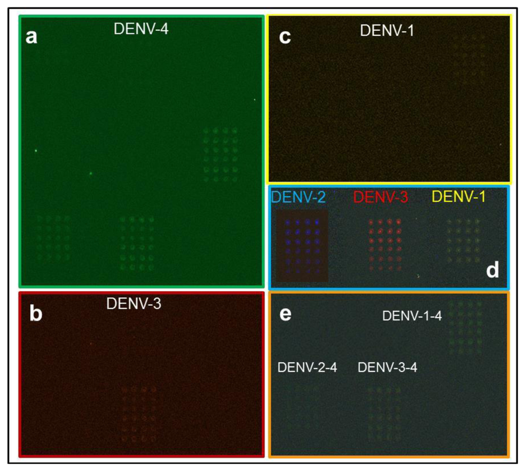 Probe specificity was analysed by normalising the fluorescence intensities for all fluorochromes. Our results showed that only one sample yielded reproducible fluorescence signals for DENV-1 and DENV-2 (Figure 4a, yellow spots). Thus, the probes have a high specificity to diagnose the four DENV serotypes even when two different serotypes are present in the same sample.
