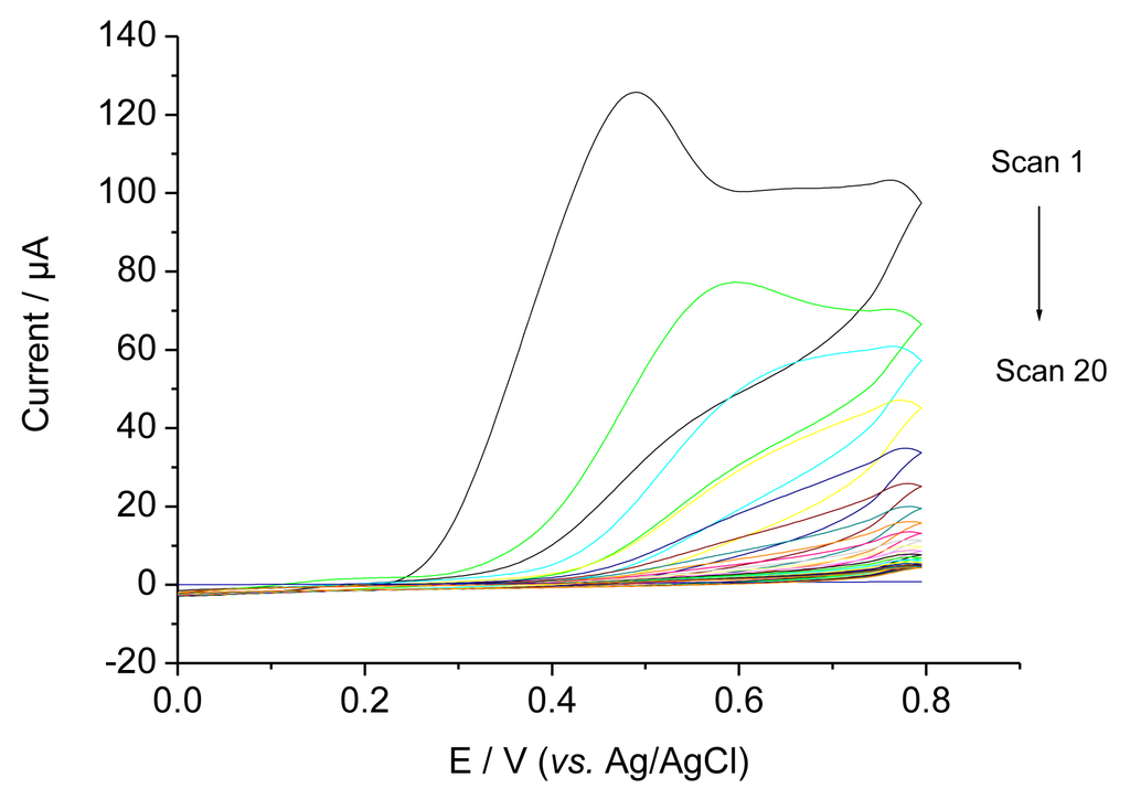 Figure 2 shows CVs during the electropolymerisation (EP) of a O-PD-Res mixture on a glassy carbon electrode in the presence of 0.4 mM TAM. In the first scan an irreversible peak was obtained between 400 and 450 mV. The current decreased with the subsequent sweeps and approached zero, indicating the formation of a non-conducting film on the electrode surface [7]. Because TAM is not electroactive in the potential range, similar CVs were obtained in the presence and absence of TAM.