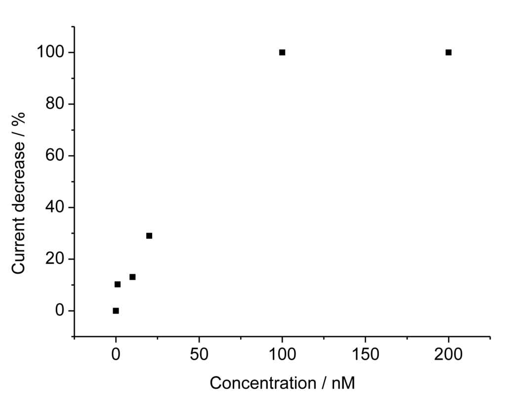 For the TAM-imprinted MIP the peak currents for the redox marker ferricyanide decreased with increasing concentration of TAM. The relative current decrease depends linearly on the TAM concentration from 1 to 100 nM and it reaches saturation above that level (Figure 4). These values show that our surface–imprinted MIP has fast rebinding and a measuring range at more than 100-fold lower concentrations than the bulk MIPs described in literature [8–11]. The TAM concentration in serum after the intake of the typical doses in breast cancer treatment of 20 mg is in the range between 50 and 300 nM. Thus our MIP sensor covers the relevant concentration range after a 1:10 dilution of the serum samples.