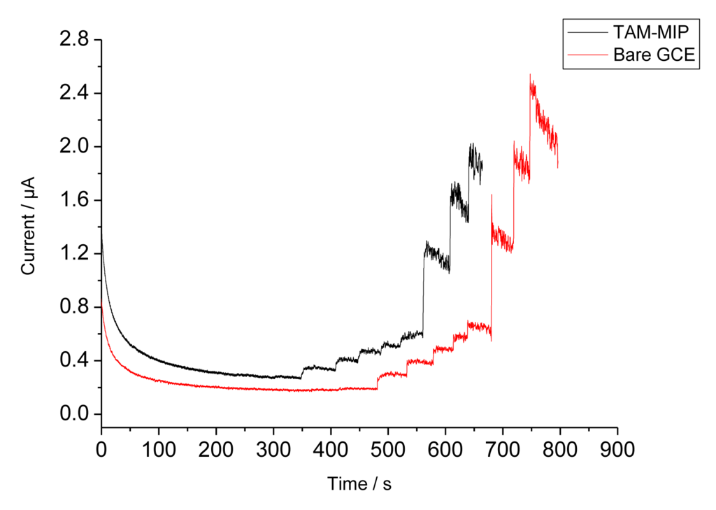 Since TAM generates an oxidation current above 900 mV [12–14], the binding of TAM to the MIP could also be investigated by measuring the anodic current at +1,100 mV. The amperometric responses of the bare GCE and the MIP covered electrode during stepwise addition of TAM are shown in Figure 5. Whilst at the NIP only a negligible current increase is found, the appearance of currents indicates that TAM can permeate through the pores of the electropolymer. However, at higher concentrations the anodic oxidation of TAM resulted in a polymer film which caused fouling of the electrode surface as reflected by the decreased current. The current of the MIP electrode increases linearly from 1 to 15 μM and it amounts to almost 80% of that of the bare electrode. However, the signal generation by the anodic oxidation of TAM leads to a signal decrease in the subsequent measurement, obviously due to the formation of an insulating film. Therefore this measuring principle is not appropriate for the characterisation of the MIP.