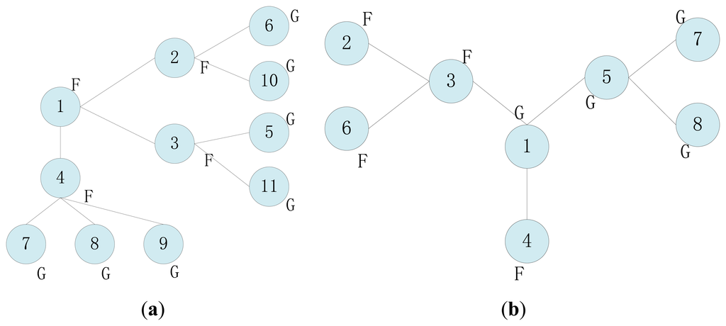 In Figure 1a, it calculates c12 = 0, c13 = 0, and c14 = 0 for node 1. Then T1 is set as LG according to Equation (3). In the same way, we get T2 = LF, T3 = LF, T4 = LF. Node 1 has no neighbor whose tendency status is LG, and then the final determinant status is set as normal based on the rule of Ti = LG. This is an obvious erroneous judgment.