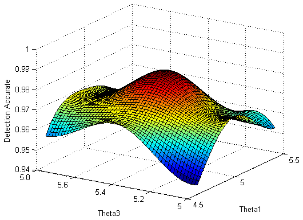 The selection of θ1 and θ3 is directly related to the judgment results, thus, to explore the best combination of θ1 and θ3 becomes the key to explore the best detection effect of uDFD. Figure 10 shows a 3D map of detection accuracy with different combinations of θ1 and θ3. Here, the number of working nodes is 80. It can be seen from the curved surface that the combination of θ1 = 5, θ3 = 5.4 approaches the peak, which means the maximum detection accuracy is 0.98.