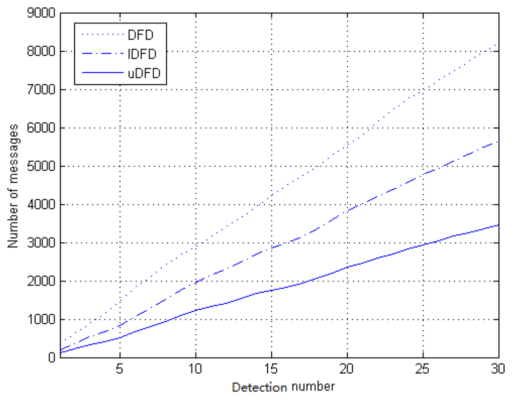 First, we analyze the number of messages transmitted in the simulated network under 40 working node conditions, which is depicted in Figure 12. When transmitting messages, nodes exchange statuses by radio broadcasting. An accumulated number of messages is recorded in the process of 30 tests. With the growth of test rounds, the number of messages shows an approximately linear upward trend. Through further calculation, approximate slopes of DFD, IDFD and uDFD are 266.7, 180.0 and 103.3, respectively. Obviously, the rate of increase of uDFD is the lowest, which means a minimum of messages transmitted during the fault detection. This is because the nodes in DFD and IDFD have to exchange all prejudged states and final judged statuses whether they are good or faulty, which leads to more interactions, while uDFD only exchanges message if the tendency status is LG or final status is good.