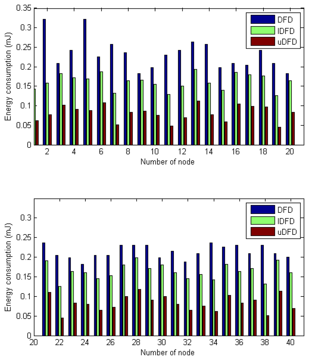 The comparison of average communication energy consumption of each node after 30 tests is shown in Figure 13. Average energy consumptions of all nodes in DFD, IDFD and uDFD are 0.235, 0.176 and 0.082 mJ. By counting and comparing the energy consumption of each node specifically, we find that uDFD has the best energy saving performance, which is caused by the reduction of interactions.