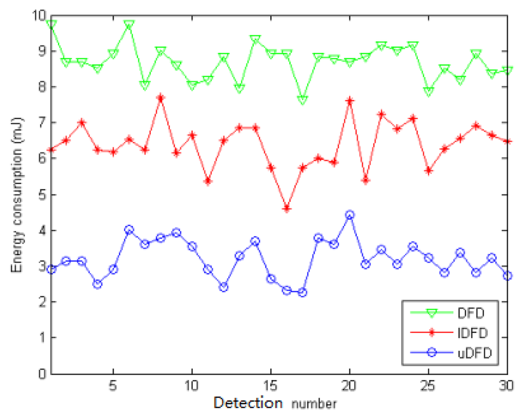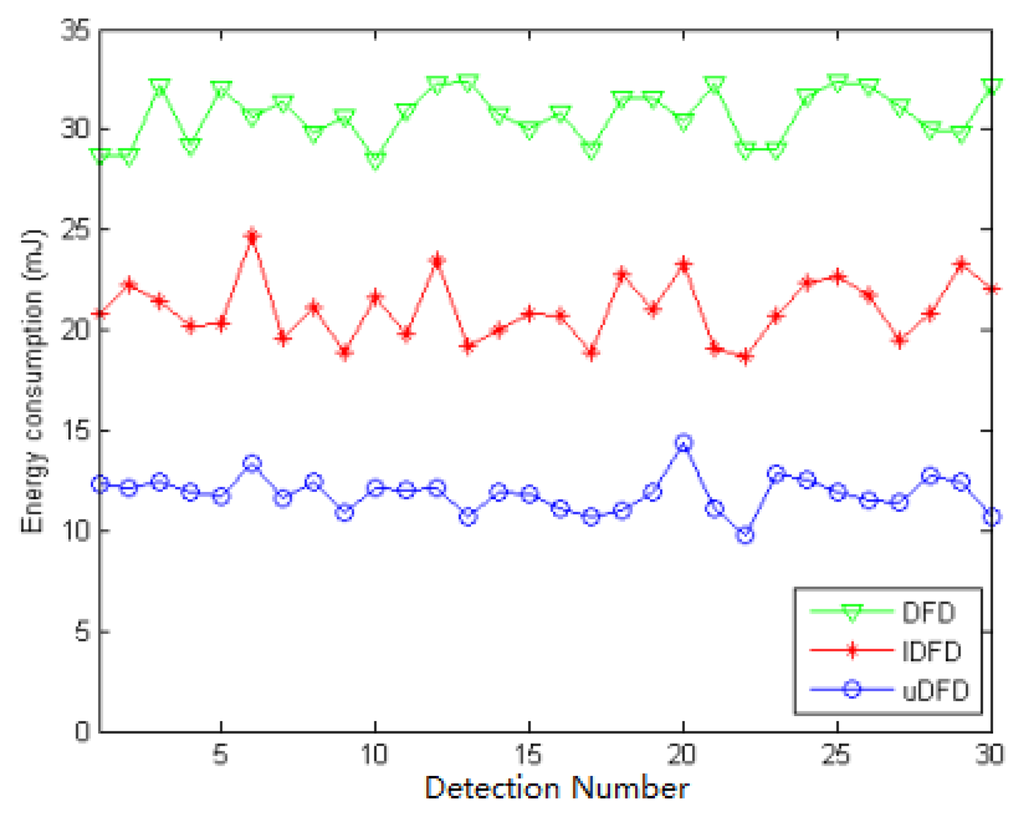 Figures 14, 15 and 16 show the energy consumption of each detection under conditions of 40, 80 and 120 working nodes. Through further calculation, under 40 working node conditions, the average energy consumption of all detections in uDFD is 2.87 mJ lower than that of IDFD and 5.47 mJ lower than that of DFD. Under 80 working node conditions, the average energy consumption of all detections in uDFD is 4.77 mJ lower than that of IDFD and 10.6 mJ lower than that of DFD.