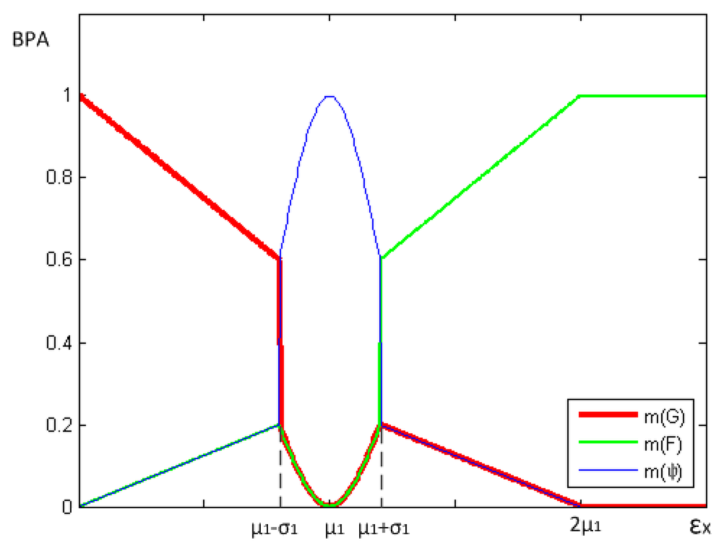 According to Equations (15) and (16), we get μ1 + σ1 = e−1/4. Here, we define σ1 = 0.1, and then μ1 = 0.68. After all above, m({G}), m({F}) and m(Ψ) can be calculated by Equations (12)–(14), respectively.