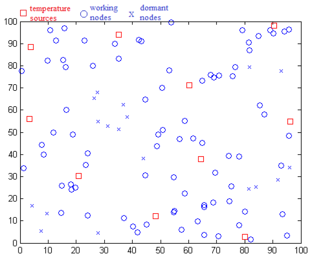 We use the MATLAB simulation tool to demonstrate our model. As shown in Figure 3, a square with a side length of 100 m is constructed in our model, in which sensors are deployed and form the network. Ten temperature sources are deployed in the square as the sensing objects of sensors. The distance between two sources is no less than L. Every temperature source randomly generates temperature data x which ranges from −5 to 40 °C. These readings simulate the temperature variation of four seasons, which means it has regularity and smoothness. Second, n sensors are deployed in this square and each of them selects the nearest temperature source which must be in the sensing range. If no temperature source exists within sensing range, a sensor is set to not work, which means no sensing from a temperature source and no communication with neighbor nodes.