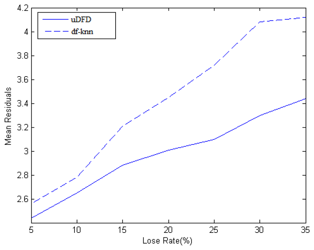 As shown in Figure 4, data loss rate is set as the horizontal ordinate, which means the ratio of the number of the data loss nodes to the sum of working nodes. The mean residual is set as the vertical ordinate, which means the average of differences between interpolation data and pre-established data and it reflects the final accuracy of the algorithms. Mean residual grows as the loss rate grows. When the loss rate is lower, the mean residual of uDFD is 0.1 lower than that of KNN, and achieves an unremarkable improvement, but as the loss rate grows higher, the improvement turns to be higher. Approximately, when the loss rate is high enough, the improvement is 0.5, which means uDFD is more suitable in the large-scale data loss situation. With the growth of data loss rate, the number of neighbors which have available data reduces, which means less information could be collected and eventually this makes the interpolation results unreliable. In comparison with df-KNN, uDFD adequately involves the historical data of neighbors to predict and solve the problem of credit reduction due to less available data, which leads to better results.