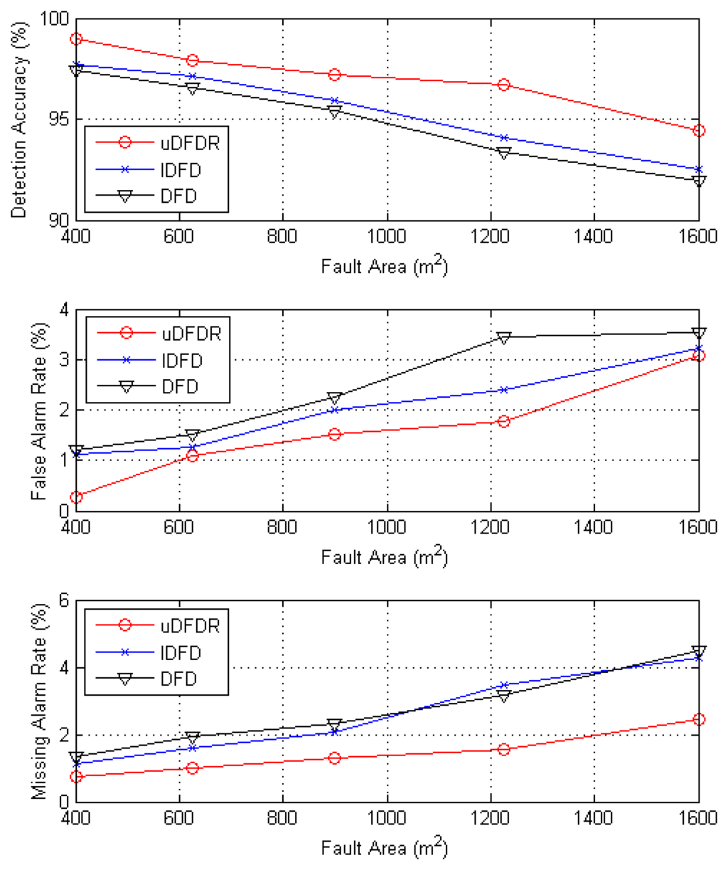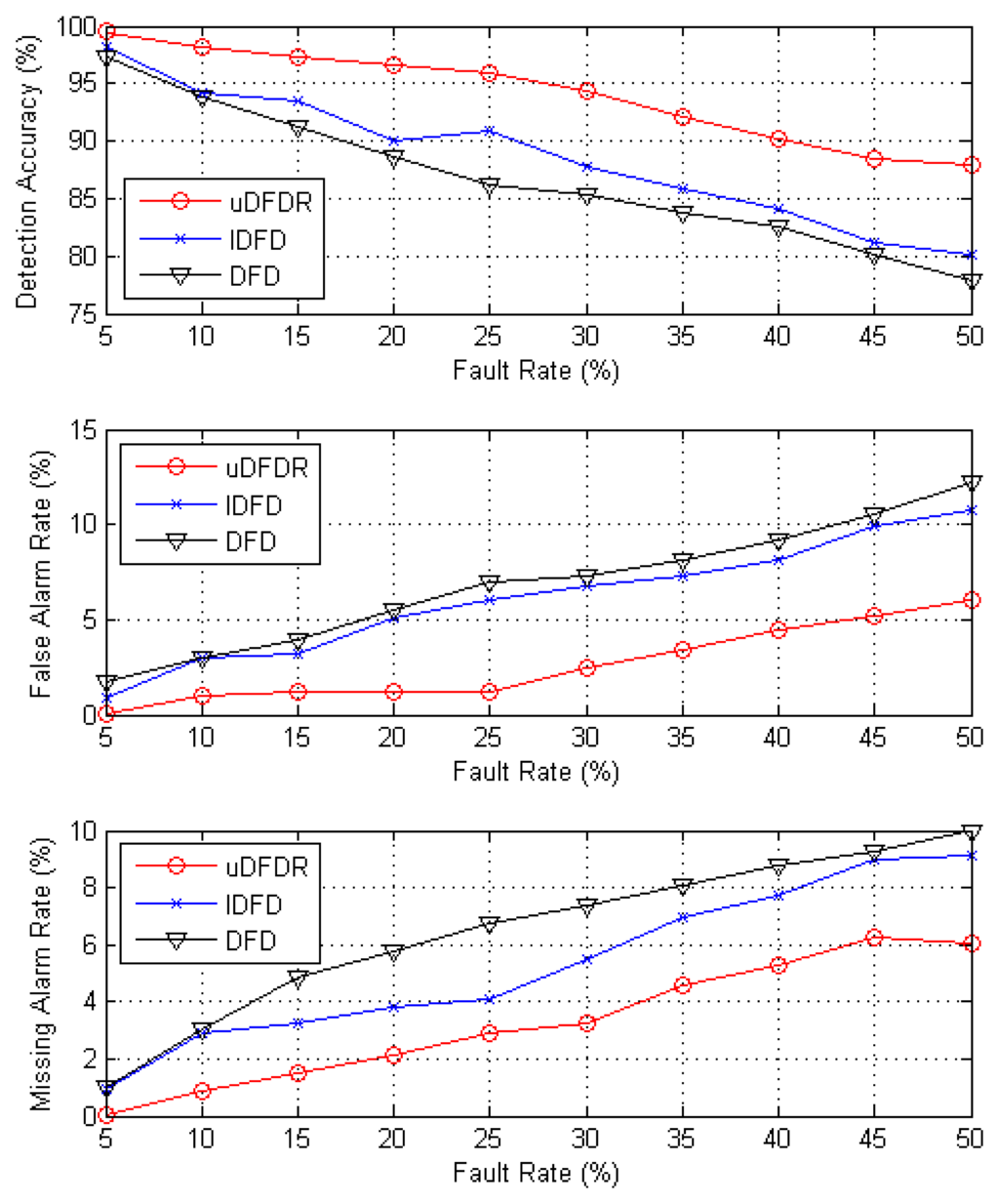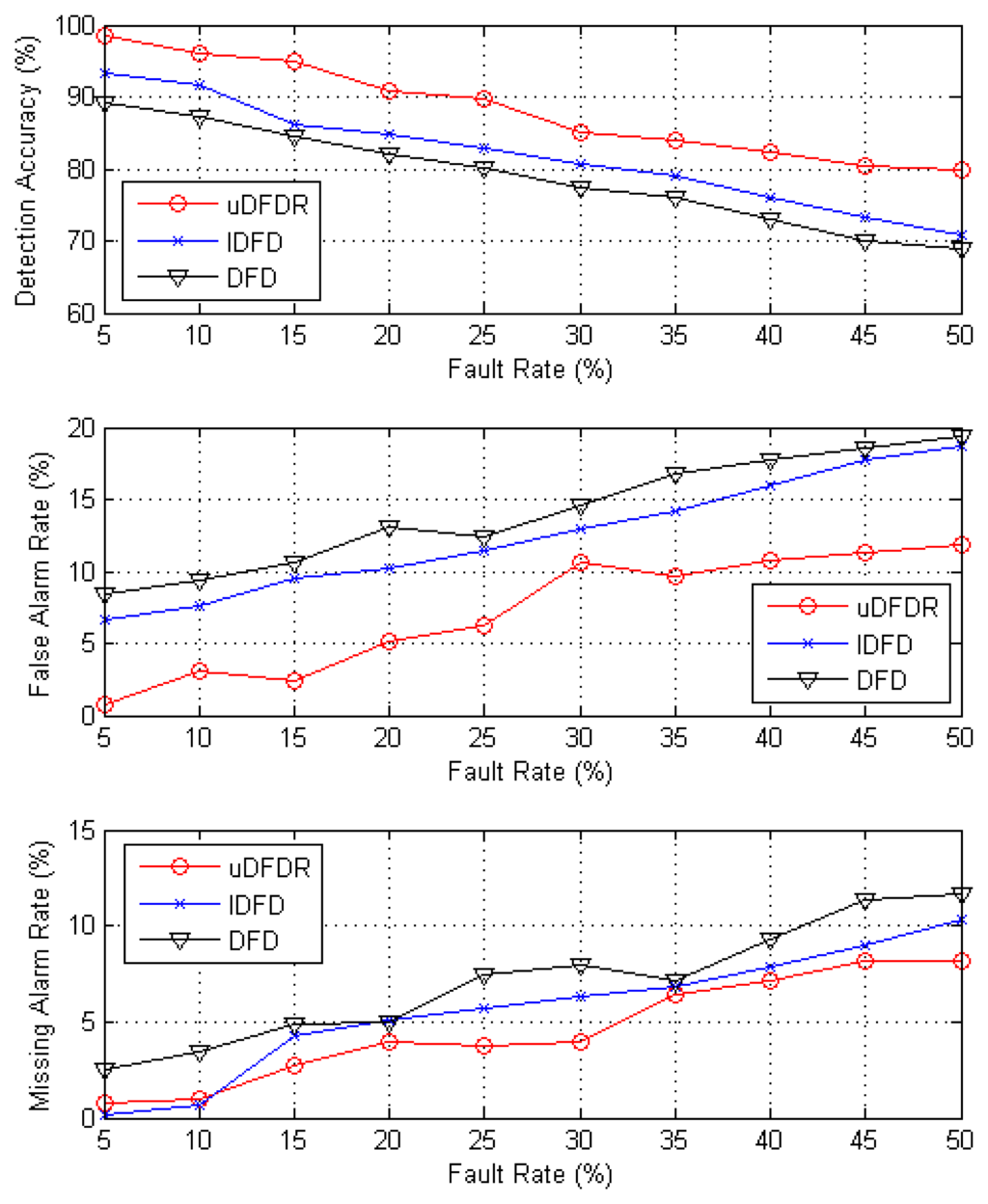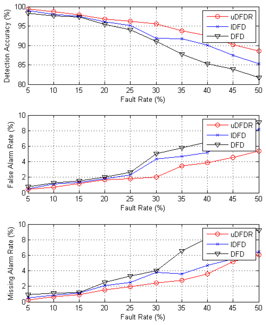 DFD, IDFD and uDFD are compared based on the constructed wireless sensor network model. Measures to be involved are detection accuracy (the ratio of number of correctly detected nodes to the sum of working nodes), false alarm rate (the ratio of number of nodes which are misjudged from good to false to the sum of working nodes), missing alarm rate (the ratio of number of nodes which are misjudged from false to good to the sum of working nodes). In this simulation, each final data point is the average of results from 30 repeats.