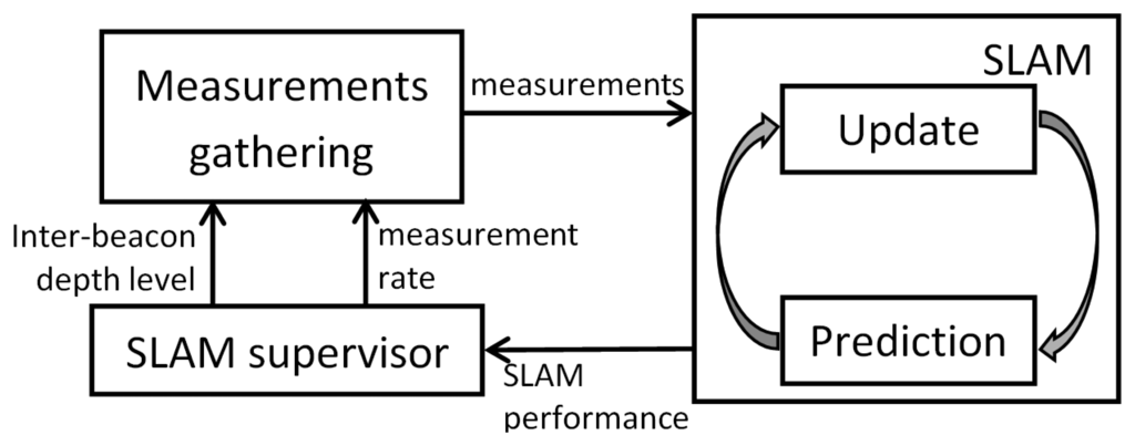 The measurement gathering module can be configured in different modes, each of them defined by the measurement gathering rate and the inter-beacon depth level. The objective of the SLAM supervisor is to analyze the SLAM performance and select the measurement gathering mode most suitable for the current conditions.