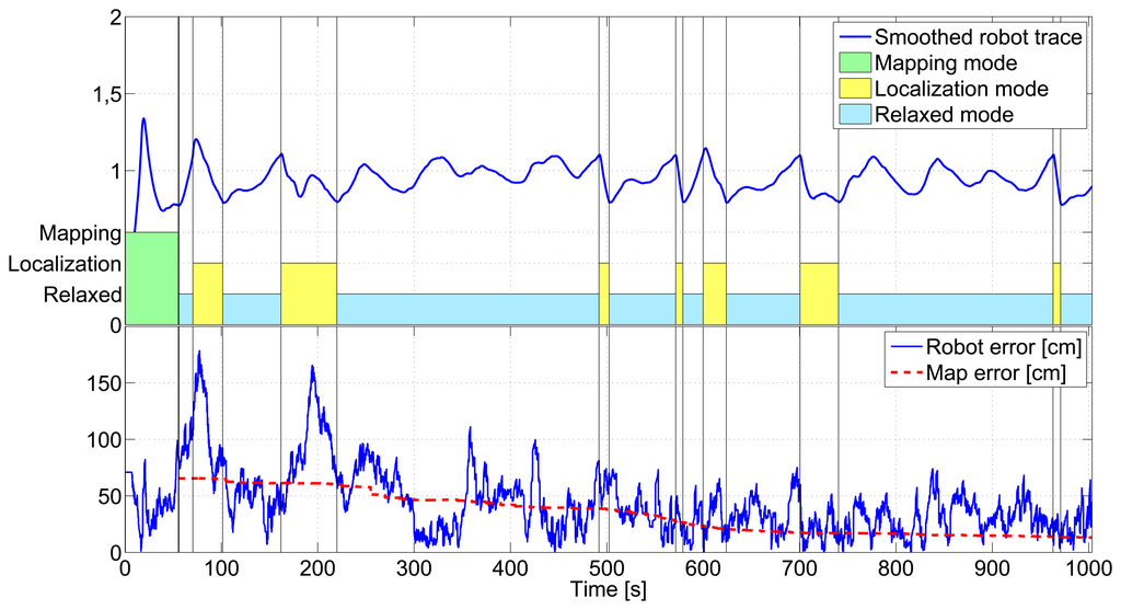 Localization mode: Its objective is to allow accurate robot self-localization in cases with higher measurement and/or odometry noise levels. The map has been already created, and measurement gathering is configured with IDL = 0 and a high rate, in order to improve robot localization. This mode is suitable in cases where good map and robot accuracies are desired, of course at the expense of having a higher consumption of resources than the Relaxed mode. The SLAM supervision module should select the Localization mode, while the robot error is above a certain threshold. When the robot error falls below the threshold, the mode is changed to Relaxed in order to save resources.