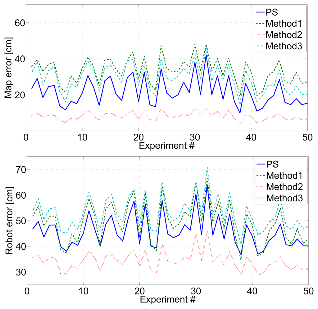 Method2 obtained the lowest map and robot mean errors, but required too high of a robot computational burden. The best tradeoffs between performance and burden were Method3 and the proposed method (PS). Both overtook Method1. In particular, the proposed method had lower map (34%) and robot error (14%) than Method1, requiring also lower computational burden (16%). When comparing with Method3, the proposed method had lower map and robot error than Method3 (19% and 31%, respectively) requiring only a bit higher computational burden (6.5%).