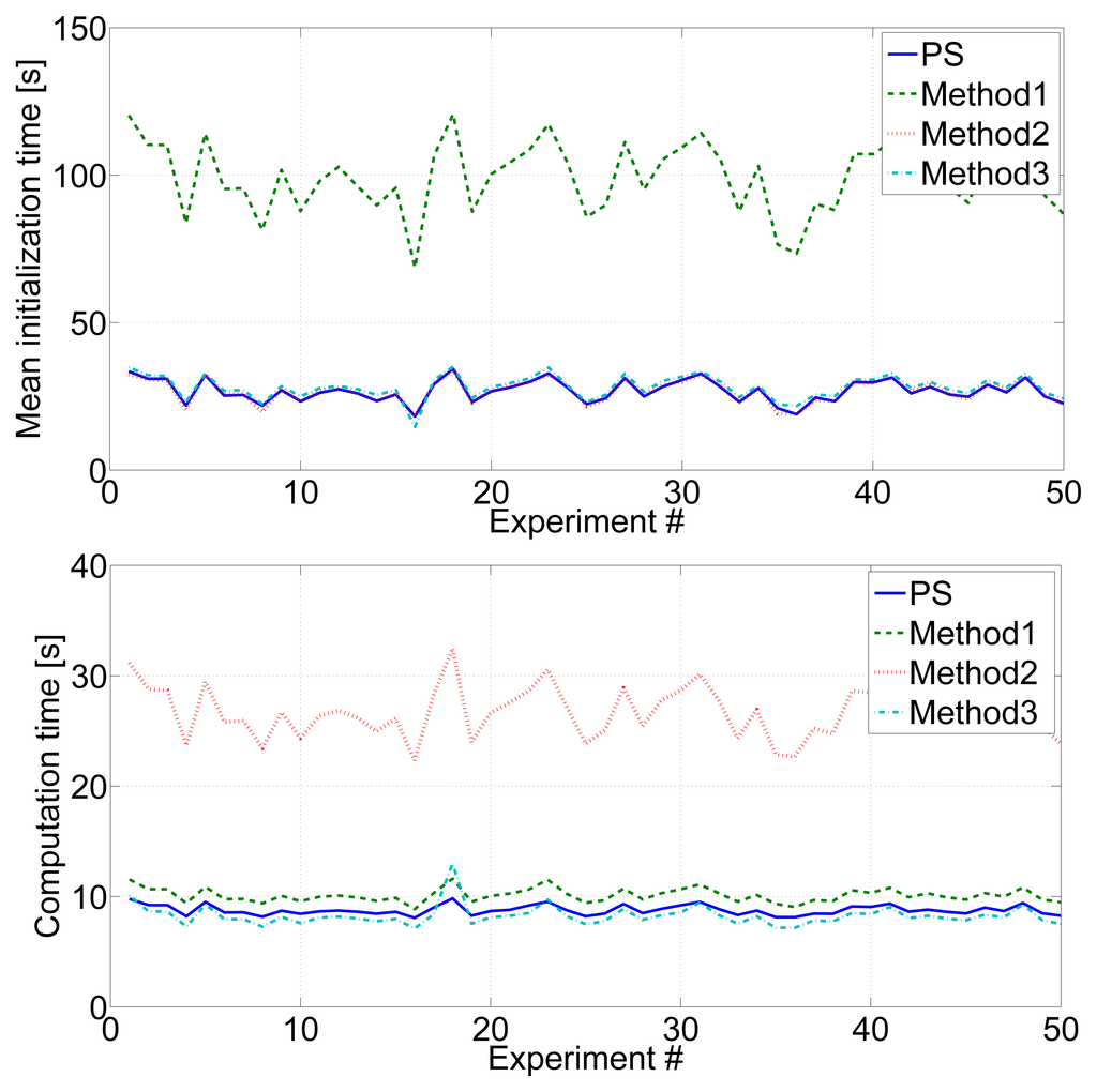 In the following, the proposed scheme (PS in the figure) is compared with Method1, Method2 and Method3. All the methods were executed with each experiment in the validation data set with exactly the same parameters. Figure 12 shows the mean beacon location errors (top) and mean robot location errors (bottom) in 50 experiments. Figure 13 shows the mean beacon initialization times (top) and the computation times required (bottom) in each of the 50 experiments.