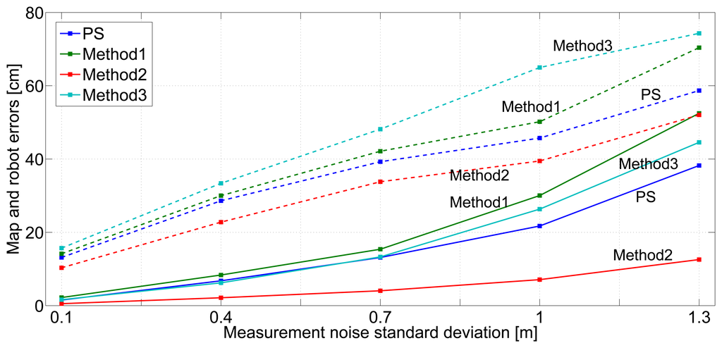 Figure 14 shows the robustness in the mean map error (full lines) and robot error (dashed lines) against measurement noise with standard deviation in the range [0.1–1.3] m. Method2 exhibited the best robustness both in map and robot errors. It uses IDL = 2 and Rate2 and integrates a very high number of measurements, achieving good robustness to measurement errors. Method1 and Method3 obtained the worst robustness. Method1 integrates only direct measurements, lacking the relations established by inter-beacon measurements and being more sensitive to measurement errors. In Method3, once the map has been initialized, measurement gathering is configured with Rate1, which is rather sensitive to measurement errors.