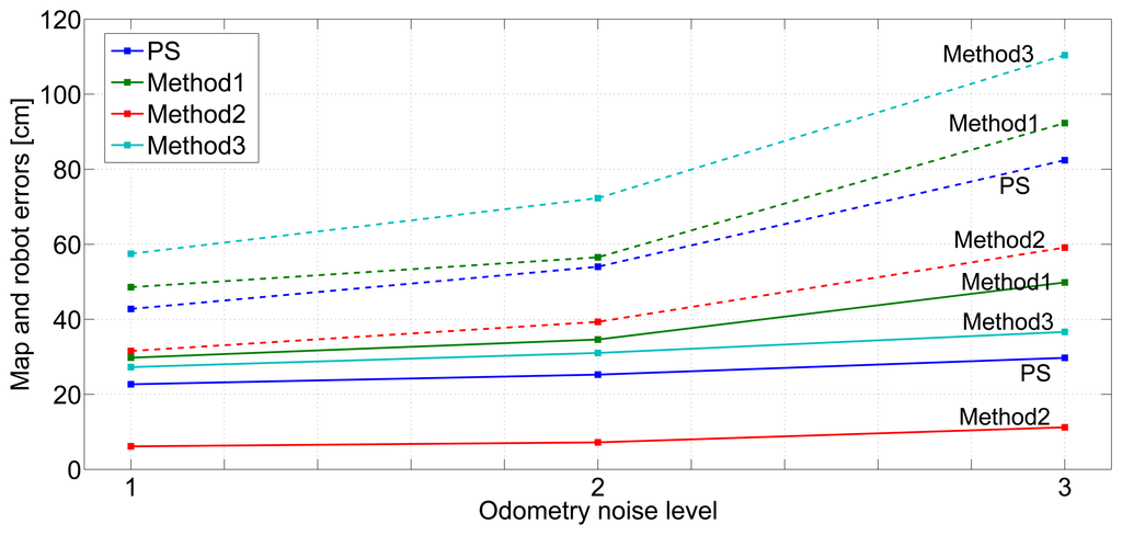 Figure 15 shows the robustness of the mean map error (full lines) and mean robot error (dashed lines) when using the odometry, O1, O2 and O3, defined in Section 6. Odometry O1 corresponds to “1” in the abscissa axis. O2 and O3 correspond to “2” and “3”. Method3 had the worst robustness against odometry noise. After map initialization, Method3 always uses Rate1, which is very sensitive to odometry noise. The best robustness was obtained with Method2. On the other hand, although the odometry noise level has a moderate influence on map error, Method1 is sensibly less robust than the rest: the rest of the methods integrate inter-beacon measurements during map initialization, making map estimation more robust to odometry noise.