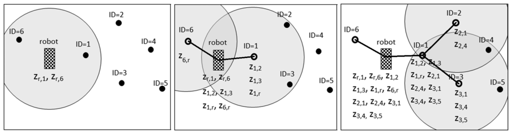 Figure 2 illustrates the operation of measurement gathering with IDL = 0, IDL = 1 and IDL = 2 and shows the measurements collected by each beacon in each case. With IDL = 0—the traditional approach where only direct robot-beacon measurements are gathered—the robot does not transmit the forward message and only collects robot-node measurements {zr,1,zr,6}, being zr,i the range between the robot and beacon i. With IDL = 1, the robot broadcasts a forward message with ttl = 1. Beacon ID = 1 receives the message, updates ttl = 0 and measures distances z1,j∀j ϵ SZ1, SZ1 being the sensing zone of beacon ID = 1. Since ttl = 0, it sends a backward message with ms1 to the robot. At the end of the backward stage, the robot has collected the following measurements: {zr,1,zr,6,z1,2,z1,3,z1,r ,z6,r}. Notice that zi,j and zj,i are not repeated measurements; they are different measurements of the same quantity. Besides, zi,j was taken by node i and zj,i by node j. The protocol obtains two measurements for each inter-beacon distance, except for the deepest beacons, of which only one is collected. Figure 2(right) shows the operation of measurement gathering with IDL = 2: the robot collects measurements between beacons that are far beyond its sensing zone. In this example, beacon ID = 1 received three forward messages. The first one was sent by the robot. It also received one from beacon ID = 2 and one from ID = 3, but they were ignored, since they had non-new Seq values.