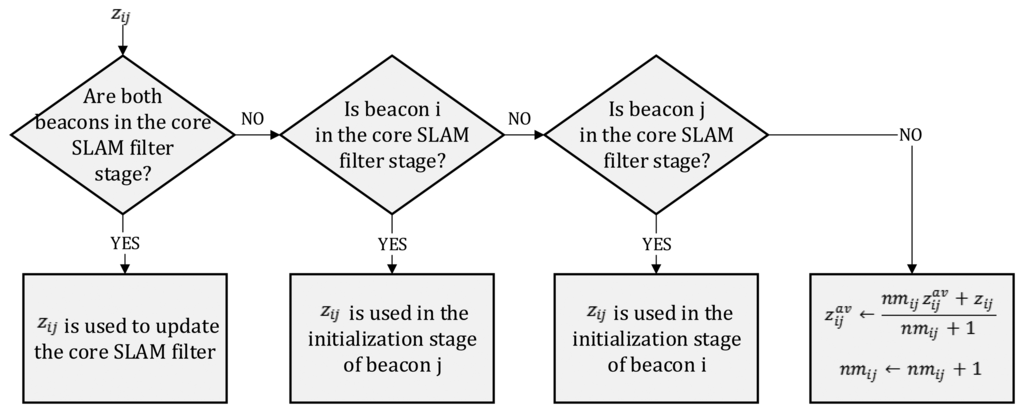 When integrating zi,j, different cases can be distinguished, depending on the stages of beacons i and j; see the summary in Figure 3. If both beacons are in the core SLAM filter stage, zi,j is used in the SLAM update stage using the following observation Jacobian: