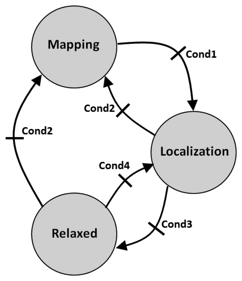 States Localization and Relaxed operate similarly. The difference is the measurement rate. The state machine stays at Relaxed, saving resources until Cond4 is satisfied, i.e., until the robot error is above threshold T4. In that case, the state changes to Localization, which involves a higher measurement rate in order to reduce the robot error. The state machine stays at Localization until the robot error is below T3 (Cond3). When Cond3 is satisfied, it changes to Relaxed to save resources.
