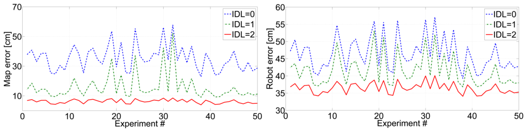 As a conclusion, using IDL = 2 is interesting while the robot initializes the map: (1) it speeds up map initialization; (2) it reduces map error; and (3) it is rather robust to the measurement noise level and to the scenario configuration. Although IDL = 2 involves a large increase in the number of measurements, the increment in resources consumption can be compensated for by its shorter map initialization times. On the other hand, although using IDL = 1 or IDL = 2 can reduce robot error, they do not seem to be a convenient solution if we analyze the performance improvement versus the increment in computational costs.