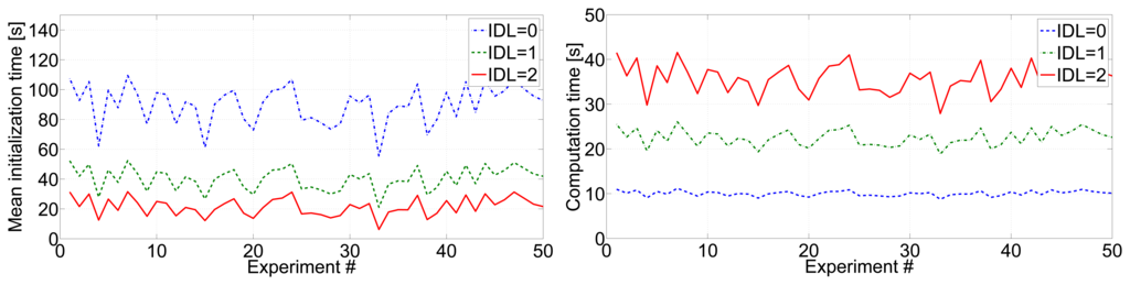As shown in Table 1, IDL has a deep impact on beacon initialization times. The improvements between IDL = 2 and IDL = 0 are rather steady around 72%, regardless of the measurement noise level. The improvements between IDL = 1 and IDL = 0 are around 50%. Besides, improvements between IDL = 2 and IDL = 0 are significantly more robust to measurement noise than those between IDL = 1 and IDL = 0.