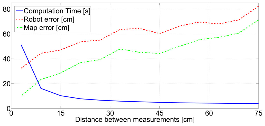 The influence of measurement gathering rate on SLAM performance is highly dependent on the robot speed. What actually affects the SLAM performance is the spatial rate, i.e., the distance between two consecutive measurement events. The SLAM method configured with IDL = 0 was executed in the experiments of the data set using distances between consecutive measurements in the range [5–75] cm. The tendency of the results, in Figure 9, is clear: higher rates involve lower map and robot errors, but a larger robot computational burden is required to integrate the measurements.